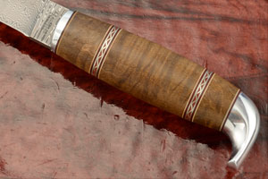 The curly maple handle is contoured to provide a comfortable grip. Fileworked spacers are filled with red resin to provide contrast. The downturned endcap locks your hand in to provide a non-slip grip.