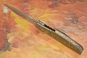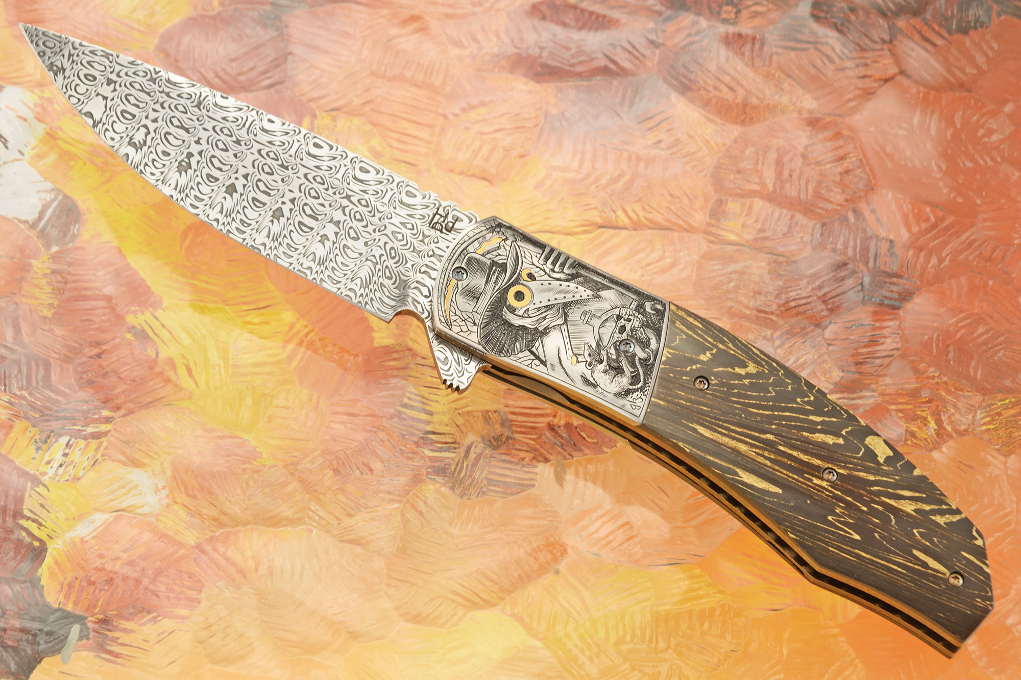 Handle scales are Light FatCarbon, contoured to provide a comfortable grip. They are nicely fit to stainless steel bolsters, which have been hand engraved and inlaid with 24k gold accents by Ilza du Plessis. Ilza is quickly gaining a significant reputation for her exquisite engraving. The plague doctor theme is exceptional and it is easily among the most impressive engravings from Ilza to date – as well as one of my favorite engravings from any artist! Bronze anodized titanium liners are textured and fileworked by hand. The liners surround a hand engraved backbar. The 3D machined Damasteel pocket clip is mounted for right-side, tip-up carry.
