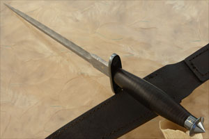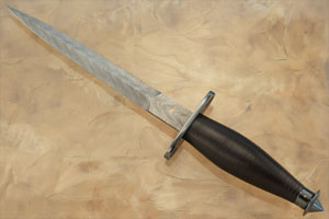 Like the original, the contoured handle is stacked leather. The pommel and guard are gun blued mild steel. 24k gold stars are inlaid into both the pommel and guard. This dress version of the V-42 pays homage to this famous combat knife.