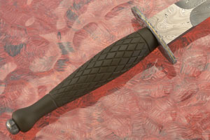 The blade is hand ground from Bjormans Twist pattern damascus forged by Damasteel in Sweden. This high performing damascus is created using powder metallurgical steel manufacturing to provide excellent edge retention and unmatched beauty. The blade is perfectly ground. Daggers are among the hardest knives to grind -- any flaw in symmetry becomes immediately noticeable.