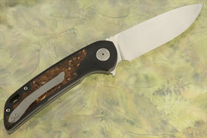 Handle scales are black G-10 and with stabilized maple burl inlays on each side. Bead blasted Gr6 titanium liners keep this knife light yet strong. The backspacer is black G10. Raised polished collars surround the bead blasted pivot. The handle is completed with a bead blasted titanium pocket clip mounted for right-side, tip-up carry.