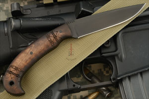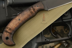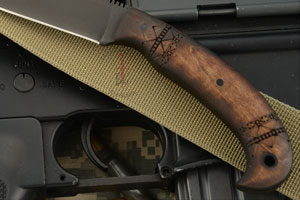 Handle: Tribal marked maple set on a distal tapered full tang