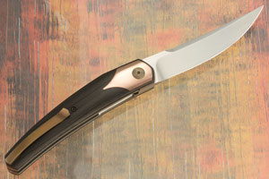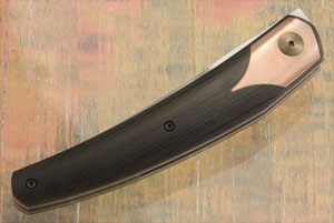 Handle scales are blackwood carbon fiber set on titanium liners. Copper ‘bolsters’ are inlaid into each side. Brass pivot rings are inlaid into the copper and surround the anodized titanium pivot. The backbar is carbon fiber, keeping the knife light, yet strong. The anodized 3D machined titanium pocket clip is mounted for right-side, tip-up carry.