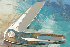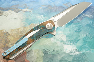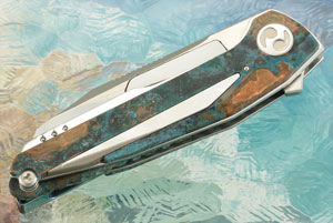 Handle scales are antiqued copper also known as a shipwreck finish due to the similarity of antiqued copper typically found under water. The scales are inlaid with matching whitelip mother of pearl on both sides of the knife. 420 stainless steel liners are textured on the sides and jewel polished in the interior. The liners surround a matching shipwreck finished copper backbar. The 3D machined titanium pocket clip is anodized and engraved with Dew's touchmark and "1 of 1".