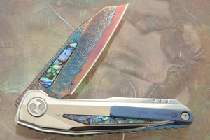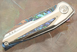 Handle scales are two-tone finished titanium. The scales are inlaid with matching abalone shell on both sides of the knife. 420 stainless steel liners are textured on the sides and jewel polished in the interior. The liners surround a blue anodized titanium backbar. The 3D machined titanium pocket clip is anodized and engraved with Dew's touchmark and "1 of 1".