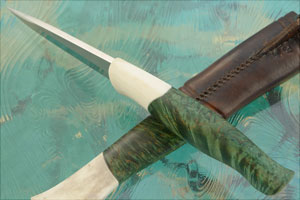 Sheath: Emerald dyed and stabilized birch, reindeer antler, and leather