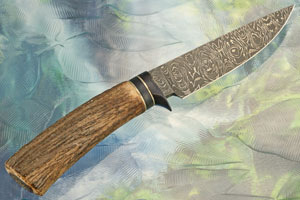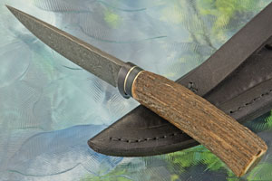 The blade is forged from Cristian's own damascus, combining carbon steels. The high contrast pattern is extremely engaging. The blade is flat ground and razor sharp. Silva's touchmark is on the left side of the blade. The blade is a perfect size for skinning and general field prep. Because the knife is forged from carbon steels, we recommend using camellia oil to oil the blade and natural antler handle.