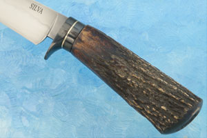 The blade is hand forged 1095 carbon steel with a differential heat treatment. Borrowing from the world of Japanese swords, Silva coated the spine with clay prior to heat treatment. The clay acts as a heat sink, keeping the spine softer and supportive, while allowing the edge to be exceptionally hard. The undulating heat treatment line seen in the blade is called a hamon. The blade is flat ground and razor sharp. Silva's touchmark is on the left side of the blade.
