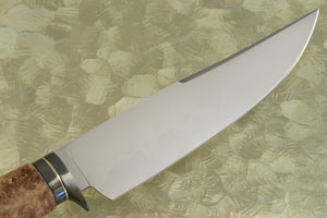 The stabilized maple burl handle provides a sure, comfortable grip. It is heirloom fit to a blackened steel guard and spacer. A central polished stainless steel spacer adds a nice touch of contrast.
