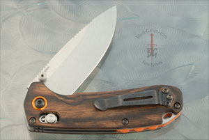 The handle uses stabilized wood scales set on stainless steel liners for a timeless look and comfortable grip. Orange pivot collars add a pop of color and compliment the orange backspacer. The spine has jimping in two spots for a secure grip no matter how you hold the knife. A recess in the scales makes attaching a lanyard simple. A reversible, split arrow pocket clip is mounted for tip-up, right hand carry.