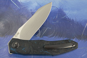 Handle scales are Blue Dark Matter FatCarbon. Jimping on the thumb ramp aids grip. The gently rounded handle feels sturdy and fills your hand perfectly. The custom pivot and collar are made from heat colored zirconium. The handle is completed with blue anodized titanium liners surrounding a carbon fiber backspacer. The zirconium pocket clip is mounted for tip-up, right-side carry.