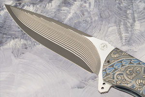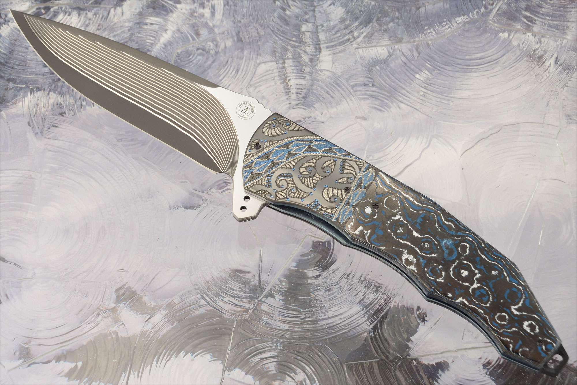 Handle scales are Frost FatCarbon. Jimping on the thumb ramp provides a comfortable, secure grip. The gently rounded handle feels sturdy and fills your hand perfectly. Heat colored zirconium bolsters are engraved, anodized, and stippled by Marietjie Thorburn. Zirconium is a transitional metal that is primarily mined in South Africa and Australia. It is resistant to corrosion and scuffing. Anodized titanium liners surround a black G10 backbar that extends into a lanyard hole. The 3D machined titanium pocket clip with ceramic retention ball is mounted for right-side, tip-up carry.