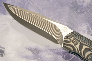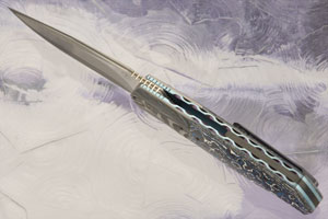The blade is hand ground stainless damascus san mai. A central bar of Takefu SG2 powdered metallurgical stainless steel is surrounded by alternating layers of stainless steel and nickel. At Hrc 63-64, this folder has among the best edge holding of any Thorburn knife ever made. The resulting damascus is high contrast and immediately captivating. The linear damascus reveals Andre's complex, super-clean grind. The flats are mirror polished, nearly hiding the pattern. The blade is hollow ground for an easy to maintain edge.
