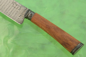 The blade and integral bolster are ladder pattern damascus, forged from 1070 and 15N20 carbon steels. The pattern is perfectly controlled and shows his considerable skills in the forge. The blade is heat treated to Hrc 59 for optimal edge holding. Creating an integral bolster shows tremendous skill. The blade is distal tapered for a perfect sense of balance. The integral bolster is fluted and heirloom fit to the handle.