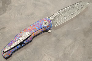The hand ground harpoon tip wharncliffe blade is Thor pattern stainless damascus forged by Damasteel in Sweden. This high performing stainless damascus is created using powder metallurgical manufacturing to provide excellent edge retention and unmatched beauty. The blade is hollow ground for an easy to maintain edge. It is perfectly centered. Ceramic bearings ensure it has silky-smooth, drop-shut action. The blade can easily be deployed using the ambidextrous flipper tab.