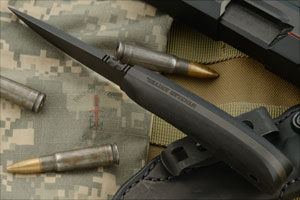 The blade is 80CrV2 carbon steel -- a steel that takes and holds an incredibly keen edge. A Caswell black oxide finish is both non-reflective and provides limited rust resistance. A skeletonized full tang reduces weight. Jimping along the spine offers an easy thumb purchase.