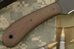 Brown laminate handle scales are set on the full tang and secured using two pins. The scales are gently rounded to fill your hand nicely.