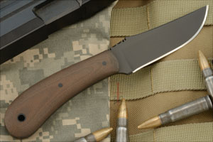 The blade is 80CrV2 carbon steel -- a steel that takes and holds an incredibly keen edge. A Caswell black oxide finish is both non-reflective and provides limited rust resistance. A skeletonized full tang means great balance. Jimping along the spine offers an easy thumb purchase.