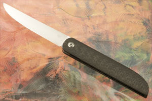 Carbon fiber handle scales are lightly contoured and extremely light. An inset titanium lockbar functions as a linerlock for easy single handed open and close. A deep carry titanium pocket clip is mounted for right-side, tip-up carry.