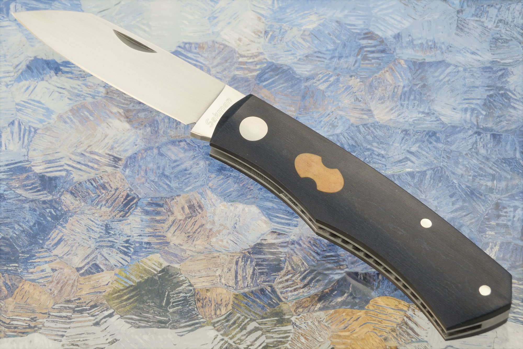 The handle is Blue Canyon Richlite. A natural Richlite shield is inlaid into the left scale. The inlay is flawless with absolutely no gaps. The liners are jewel polished in the interior.