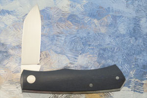 The blade is hand ground M390 premium stainless steel. M390 is a super-steel created by Bohler in Austria. It takes an incredibly sharp edge and holds onto it due to a high concentration of vanadium and chromium carbides. Its unique powder metallurgical process also promotes a uniform carbide distribution and clean steel properties, making M390 a popular steel used in surgical cutting instruments and in applications requiring a high finish. It offers excellent corrosion resistance due to its high concentration of chromium. The blade is hollow ground for an easy to maintain edge. It is well centered with a firm half stop -- easily opened with the right-handed thumb nick.