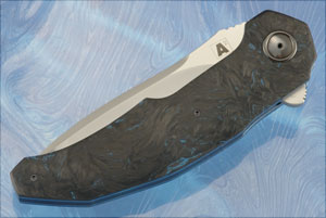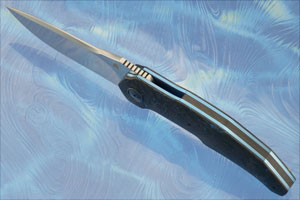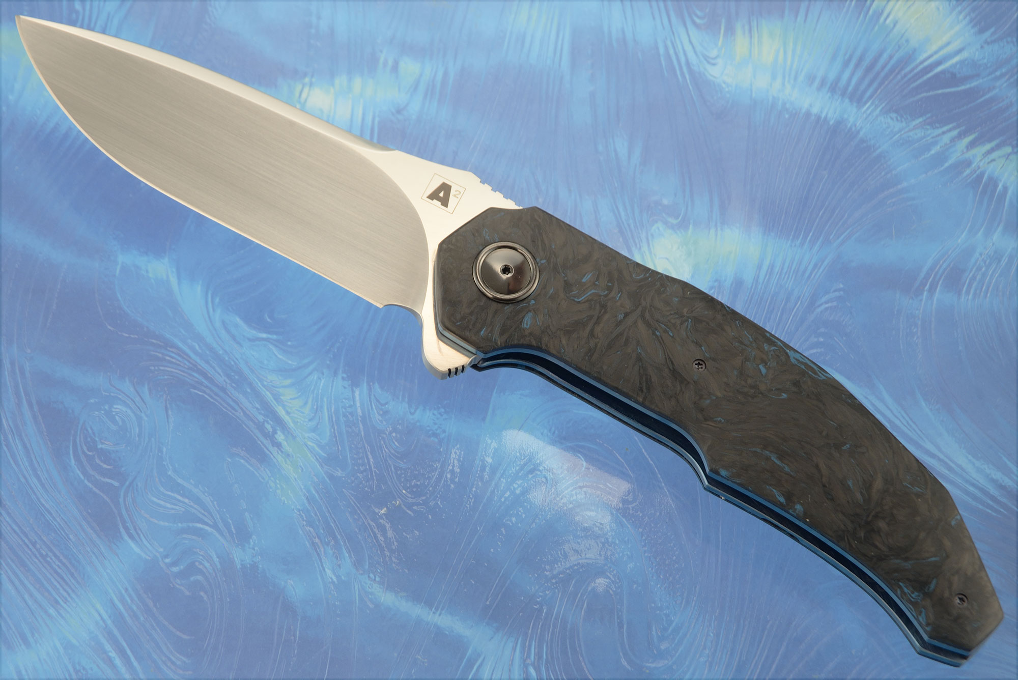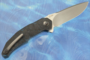 Handle scales are Blue Dark Matter FatCarbon. The custom external pivot is heat colored zirconium and is surrounded by a matching zirconium pivot collar. Jimping on the thumb ramp aids grip. The gently rounded handle feels sturdy and fills your hand perfectly. Anodized titanium liners surround a carbon fiber backbar. The 3D machined zirconium pocket clip is mounted for right-side, tip-up carry.
