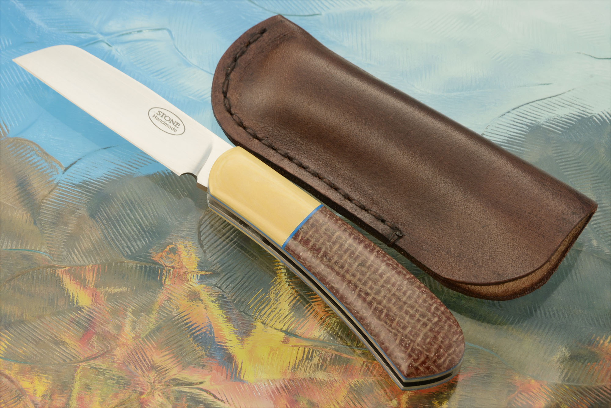 Brown burlap Micarta handle scales are set on stainless steel liners. They meet perfectly with antique ivory paper Micarta bolsters. Blue fiber liners nicely complement the scales and will help the wood adjust to humidity and temperature changes. The contoured handle is very comfortable in hand.