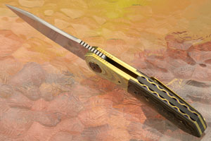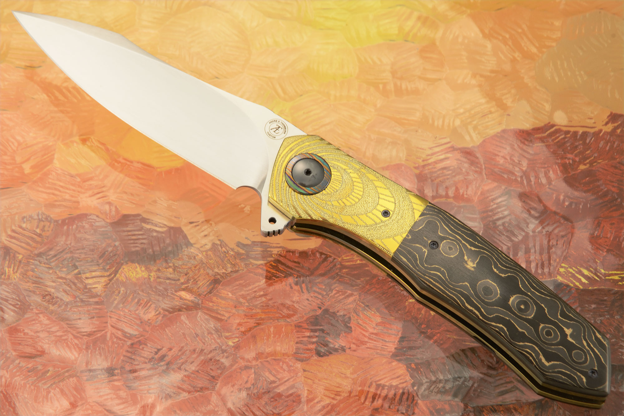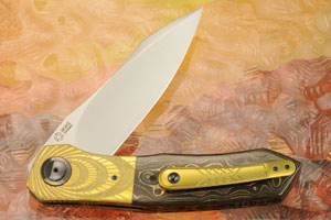 Handle scales are Gold Camo FatCarbon fit to anodized titanium bolsters engraved by Marietjie Thorburn. Jimping on the thumb ramp provides a comfortable, secure grip. The gently rounded handle feels sturdy and fills your palm perfectly. Anodized titanium liners surround a black carbon fiber backbar. Titanium/zirconium damascus pivot collars surround the zirconium pivot. The anodized titanium pocket clip is mounted for right-side, tip-up carry.