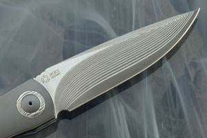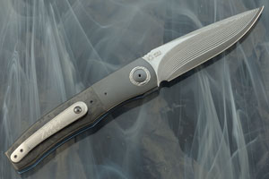 Marble carbon fiber handle scales complement the blade and meet perfectly with heat colored zirconium bolsters. The external pivot is heat colored zirconium. The pivot collar is stainless damascus forged by Damasteel. The titanium liners are fileworked and anodized They surround a carbon fiber backspacer. The 3D machined titanium pocket clip with ceramic retention ball is mounted for right-side, tip-up carry.