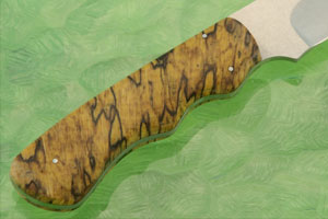 The dramatic handle is spalted beech wood, set on the full tang using stainless steel pins. Finger grooves make it particularly easy to keep a firm grip -- even when hands are wet.