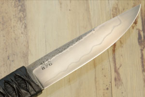 The blade was forged to shape from W2 carbon steel. A traditional clay zone heat treatment resulted a clear hamon traveling across the blade. The undulating line shows the transition between soft, supportive steel at the spine and hard cutting steel at the edge. The flats are forge finished.