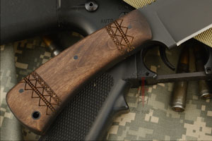 The blade is 1/4" 80CRV2 carbon steel with a non-glare Caswell finish. Tribal maple handle scales are set on the distal tapered full tang, reducing overall weight. The handle is completed with a lanyard hole.
