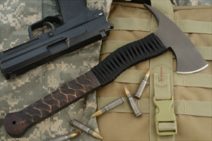 A Boltaron sheath with a nylon retention cord keeps the axe close by and can be attached to a belt or MOLLE compatible equipment.