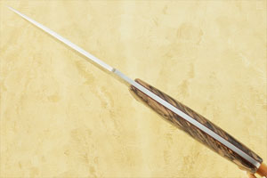 The 5-1/2 inch blade is hand ground 154CM stainless steel and features a hand rubbed satin finish. 154CM combines good edge holding with excellent chip resistance and high corrosion resistance. The blade is flat ground and razor sharp. David's touchmark is on the left side of the blade.