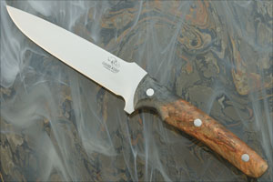 The 5-1/2 inch blade is hand ground 154CM stainless steel and features a hand rubbed satin finish. 154CM combines good edge holding with excellent chip resistance and high corrosion resistance. The blade is flat ground and razor sharp. David's touchmark is on the left side of the blade.