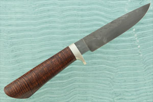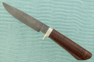 The handle is exhibition grade ringed gidgee ((Acacia cambagei). Gidgee is an exceptional wood for knife handles and is considered to be one of Australia's most beautiful timbers. It has tremendous stability even when exposed to fluctuations in humidity and temperature. It is among the densest woods in the world and has a beautiful curl similar to Hawaiian koa. The handle provides a sure, non-slip grip. The handle is perfectly fit to a satin finished 416 stainless steel guard.