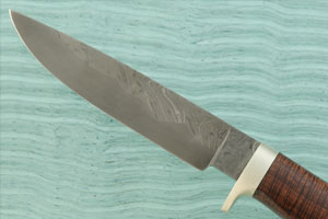 The drop point blade is forged from Gary's own damascus san man. Damascus sides are forged around a high performing 1080 carbon steel core, ensuring exceptional edge holding with chip resistance. The flat ground blade has excellent cutting geometry. Gary's touchmark is on the left side of the blade.