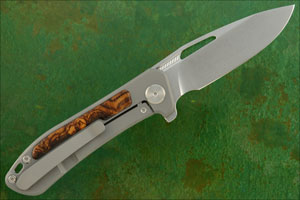 A glass bead blasted grade 5 titanium frame ensures this mid-size folder will be light in the pocket, yet have tremendous strength and durability. Each side features a presentation grade Arizona desert ironwood inlay. The ironwood has a a nice mix of light and dark warm tones. Screws throughout were made in the Arno Bernard workshop and are grade 4 titanium, allowing them to be anodized. Ensuring rigid, yet light construction, the backspacer is grade 5 titanium.