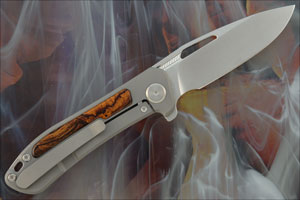 A glass bead blasted grade 5 titanium frame ensures this mid-size folder will be light in the pocket, yet have tremendous strength and durability. Each side features a presentation grade Arizona desert ironwood inlay. The ironwood has a a nice mix of light and dark warm tones. Screws throughout were made in the Arno Bernard workshop and are grade 4 titanium, allowing them to be anodized. Ensuring rigid, yet light construction, the backspacer is grade 5 titanium.