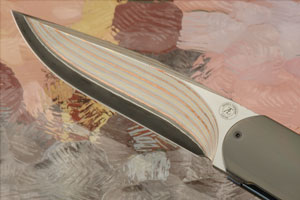 The blade is hand ground Stainless Yu-Shoku san mai made by Takefu Special Steel in Japan. This san mai features undulating, brightly colored brass, copper and stainless steel sides surrounding a VG-10W core. VG-10W achieves excellent wear resistance and chip resistance at 60-61 Hrc. The effect created by the mokume gane sides is extremely captivating!