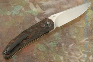 Handle scales are Copper Dark Matter FatCarbon. Jimping on the thumb ramp aids grip. The gently rounded handle feels sturdy and fills your hand perfectly. The custom pivot and collar are heat colored zirconium. The handle is completed with bronze anodized titanium liners surrounding a carbon fiber backbar. The 3D machined heat colored zirconium pocket clip is mounted for tip-up, right-side carry.