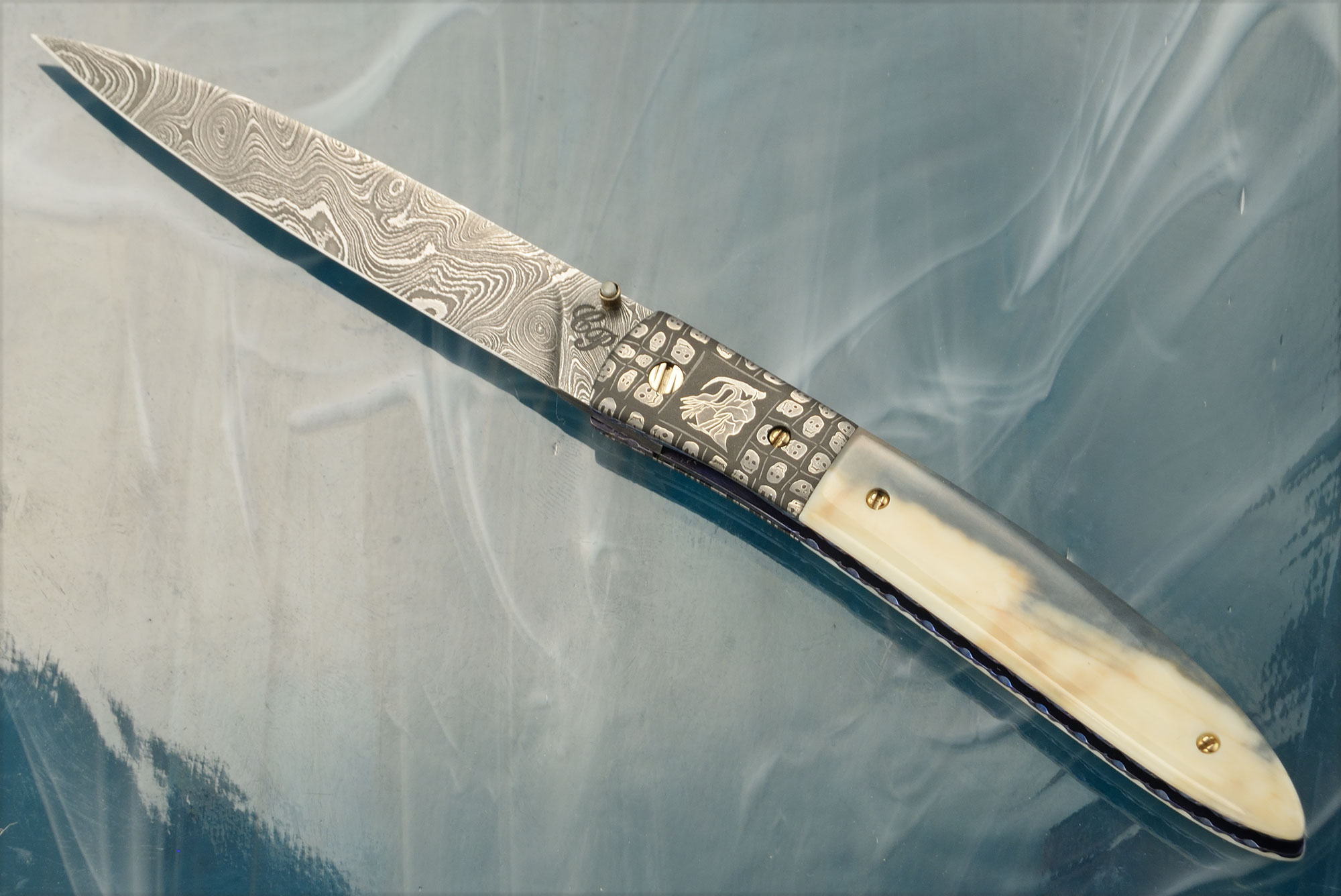 The blade is perfectly centered and has silky-smooth action. It can be easily deployed using the right-side thumbstud inlaid with ancient walrus ivory.