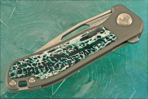 A glass bead blasted grade 5 titanium frame ensures this mid-size folder will be light in the pocket, yet have tremendous strength and durability. Each side features a stabilized and dyed kudu horn inlay. The stabilized inlay is formed from the interior of the kudu horn and combines green and cream tones. Screws throughout were made in the Arno Bernard workshop and are grade 4 titanium, allowing them to be anodized. Ensuring rigid, yet light construction, the backspacer is grade 5 titanium.
