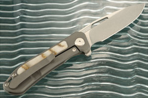 A glass bead blasted grade 5 titanium frame ensures this mid-size folder will be light in the pocket, yet have tremendous strength and durability. Each side features natural sheephorn inlay. The natural texture of the sheep horn provides a dramatic, sure grip. Screws throughout were made in the Arno Bernard workshop and are grade 4 titanium, allowing them to be anodized. Ensuring rigid, yet light construction, the backspacer is grade 5 titanium.