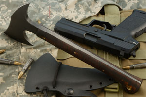 The Rum Runner features a 3.2 inch cutting edge and measures 6-1/2 inches from the edge to the back of the spike. The base of the haft to the top of the head measures at approximately 12-3/4 inches. Maple handle scales are set on the full tang. The axe is long enough to deliver an effective blow but short enough to be carried on the belt.