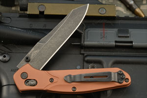 The Benchmade Osborne is one of Benchmade’s most popular models. Designed by Warren Osborne, both the full size and Mini Osborne are capable tools in an ergonomic package. This Osborne (940BK-03) features a Burnt Copper aluminum handle. The clip and screws have a black oxide finish, complimenting the color scheme of the handle. The split arrow pocket clip may be mounted for left- or right-side, tip-up carry. The contoured handle is comfortable in a variety of grip styles, while jimping near the spine prevents thumb slip. The blade is easily opened using the thumbstuds and has solid lockup thanks to the AXIS mechanism.