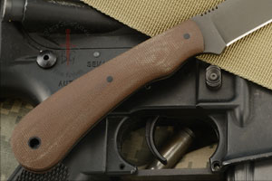 Brown laminate handle scales are set on the full tang. The handle provides a secure, comfortable grip.