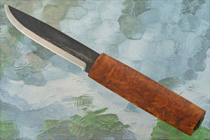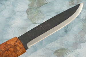 The handle is masur birch, hand contoured to provide a comfortable grip. The tang reaches all the way through the handle and is pinned old style with a diamond shaped washer.