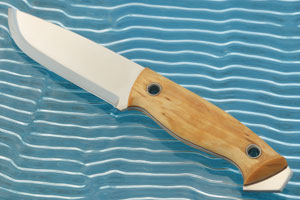 Masur birch handle scales are set on the full tang using two rivets. The rivets are pierced to allow for a lanyard setup for extra retention. The pommel extends beyond the handle which also be used to strike a ferro rod, crack open nuts, and other similar tasks. Red liners contrast elegantly against the bright birch scales.