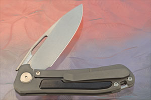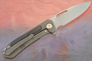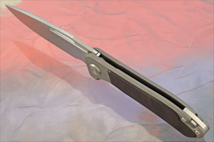 A glass bead blasted grade 5 titanium frame ensures this mid-size folder will be light in the pocket, yet have tremendous strength and durability. Each side features African blackwood (Dalbergia melanoxylon) inlay. The near-black wood has slight chocolate striations for a dramatic appearance. Screws throughout were made in the Arno Bernard workshop and are grade 4 titanium, allowing them to be anodized. Ensuring rigid, yet light construction, the backspacer is grade 5 titanium.